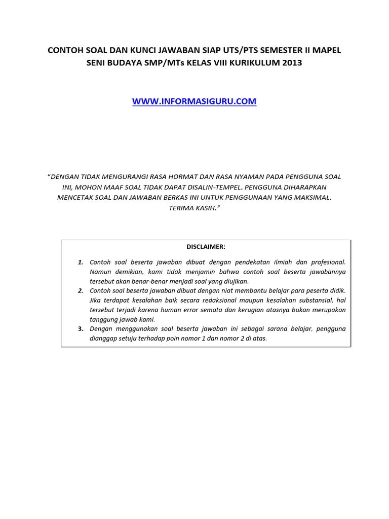 5 poin kunci jawaban pilihan ganda kelas 8 semester 2 halaman 189 sampai 191 tanyakan detil pertanyaan. Pdf uts sbdp kelas 5 sem 2 k13 bang fajar academia edu. Dengan demikian materi soal jawab utspts 2 seni budaya smpmts kelas 8 kurikulum 2013 ini memenuhi unsur kebaruan atau novelty. Dalam 100 contoh soal seni budaya kurikulum 2013 ini mungkina da beberapa karakteristik soal, yaitu soal mudah, sedang, dan sukar/ sulit. Jawaban uji kompetensi 6 matematika kelas 8 kurikulum 2013.